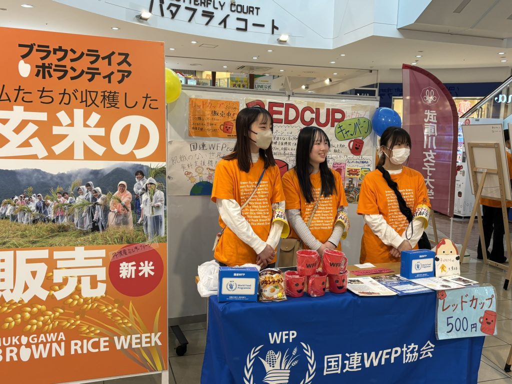 2月14・15日ららぽーと甲子園にて今年も「武庫女フェス」が開催され、ブラ★ボラも参加しました。ブラ★ボラの活動紹介、田植え~稲刈りまでした田んぼの玄米販売、寄付先の国連WFPの広報、レッドカップ販売、募金と、一生懸命声掛けをして活動しました。玄米の収益及び募金は、国連WFP「学校給食プログラム」の支援に使用します。